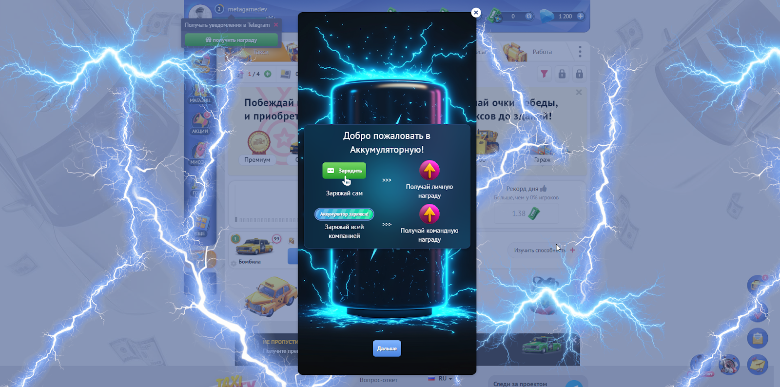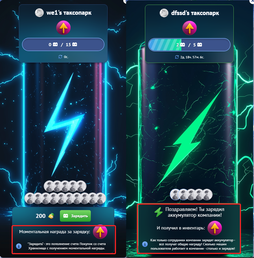 Каждый заряд — это перевод средств внутри твоего аккаунта со счета “хранилища” на счет “покупок”. Когда аккумулятор полностью заряжен, вся компания получает общий бонус.