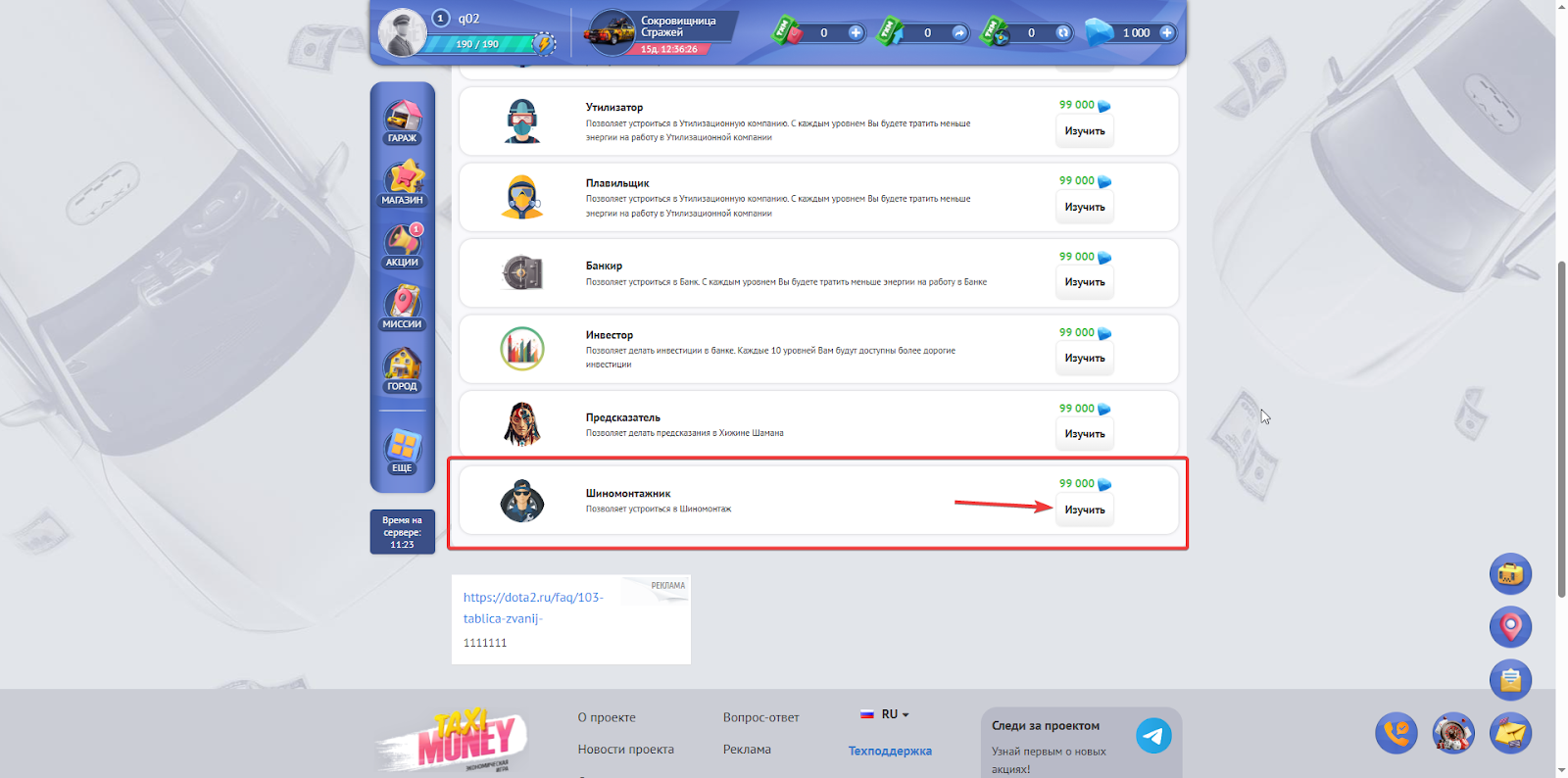 Также за работу в “Шиномонтажке” Ваш навык “Шиномонтажника” будет автоматически улучшатся, что позволит Вам сократить расход энергии во время работы и с каждым новым уровнем навыка Ваша личная перезарядка будет сокращаться.
