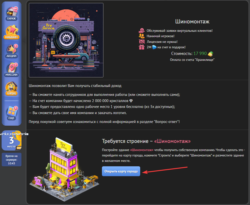 После этого, Вы автоматически окажетесь в Полисе, с открытым окном здания “Шиномонтаж”, нужно будет нажать “Построить за”